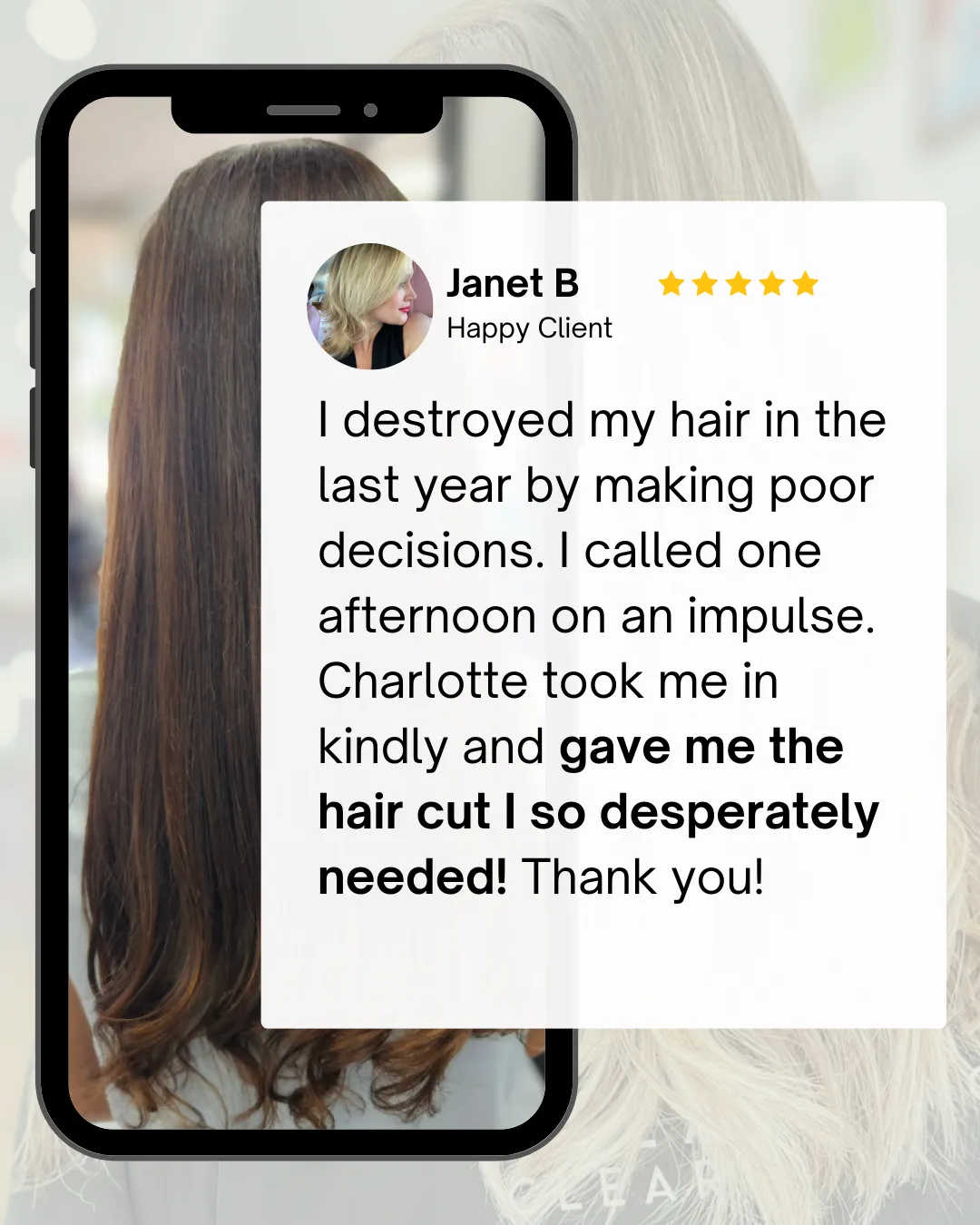 "Charlotte saved my hair! I destroyed my hair in the last year by making poor decisions. I called one afternoon on an impulse. Charlotte took me in kindly and gave me the hair cut I so desperately needed! Thank you!